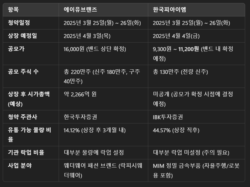 이번 에이유브랜즈와 한국피아이엠 모두 시장의 관심이 높은 종목들입니다. 하지만 단순히 기관 경쟁률만 보고 판단하지 마시고, 유통 가능 물량, 락업 비율, 상장 일정 등을 종합적으로 고려하여 투자 결정을 내리시기 바랍니다.