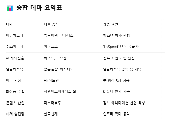 #비만치료제 #수소에너지 #AI해외진출 #탈플라스틱 #웹툰콘텐츠 #화장품수출 #정책수혜주