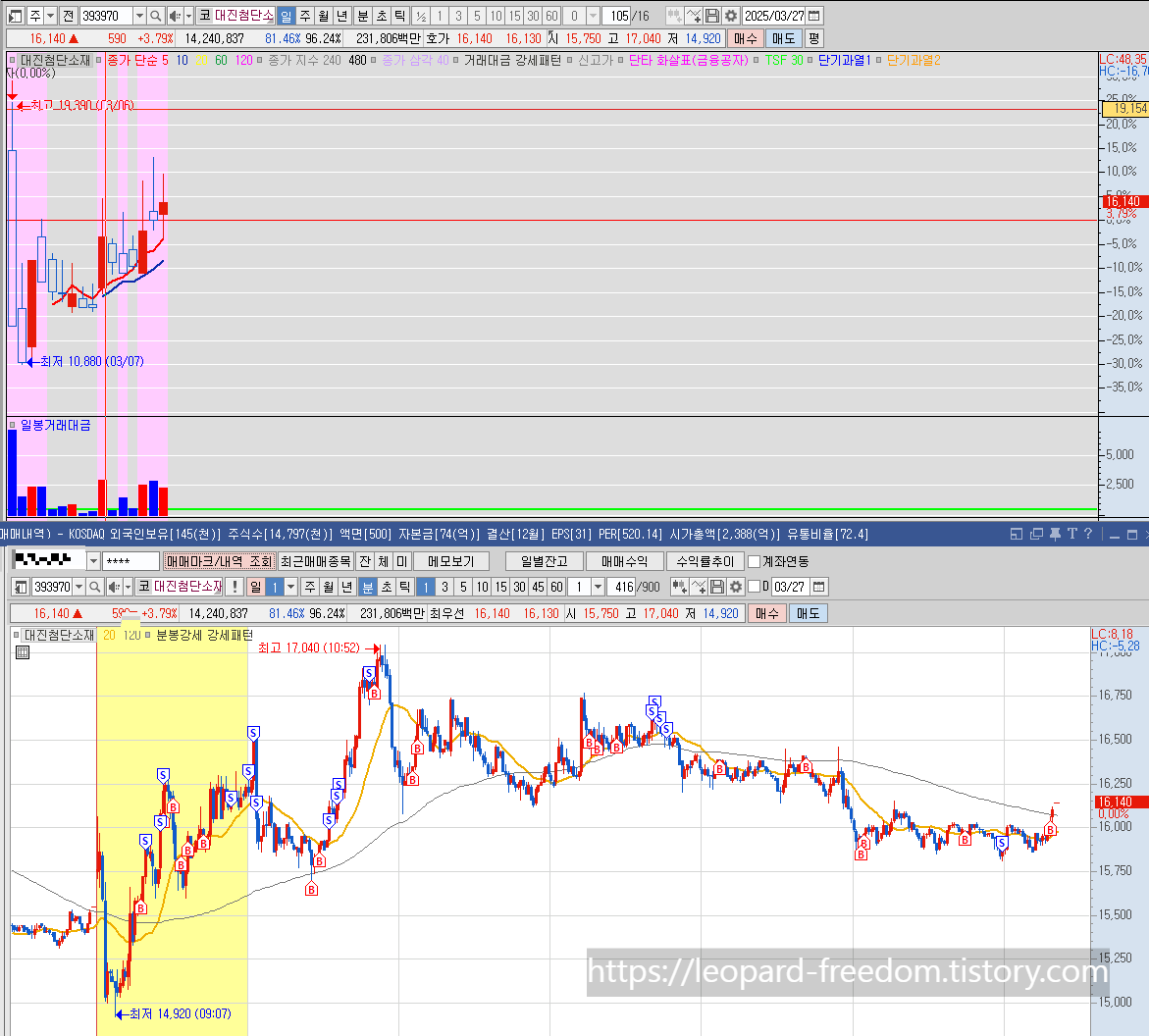 대진첨단소재는 호가창 움직임이 뚜렷하고, 세력 개입 여부가 차트에 잘 드러나기 때문에 초단타매매에 적합한 종목입니다. 최근 급등락을 반복하며 단타 매매자들의 관심을 받았죠.