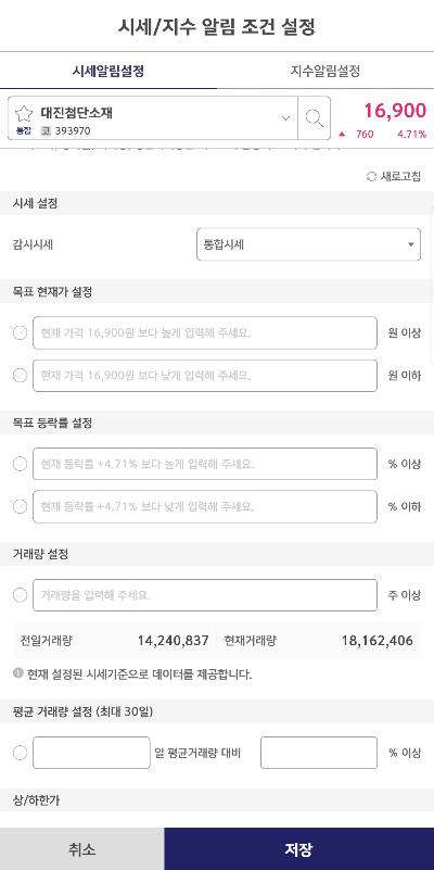 - 시세/지수 알림 조건 설정 창에서 원하는 조건을 설정합니다.